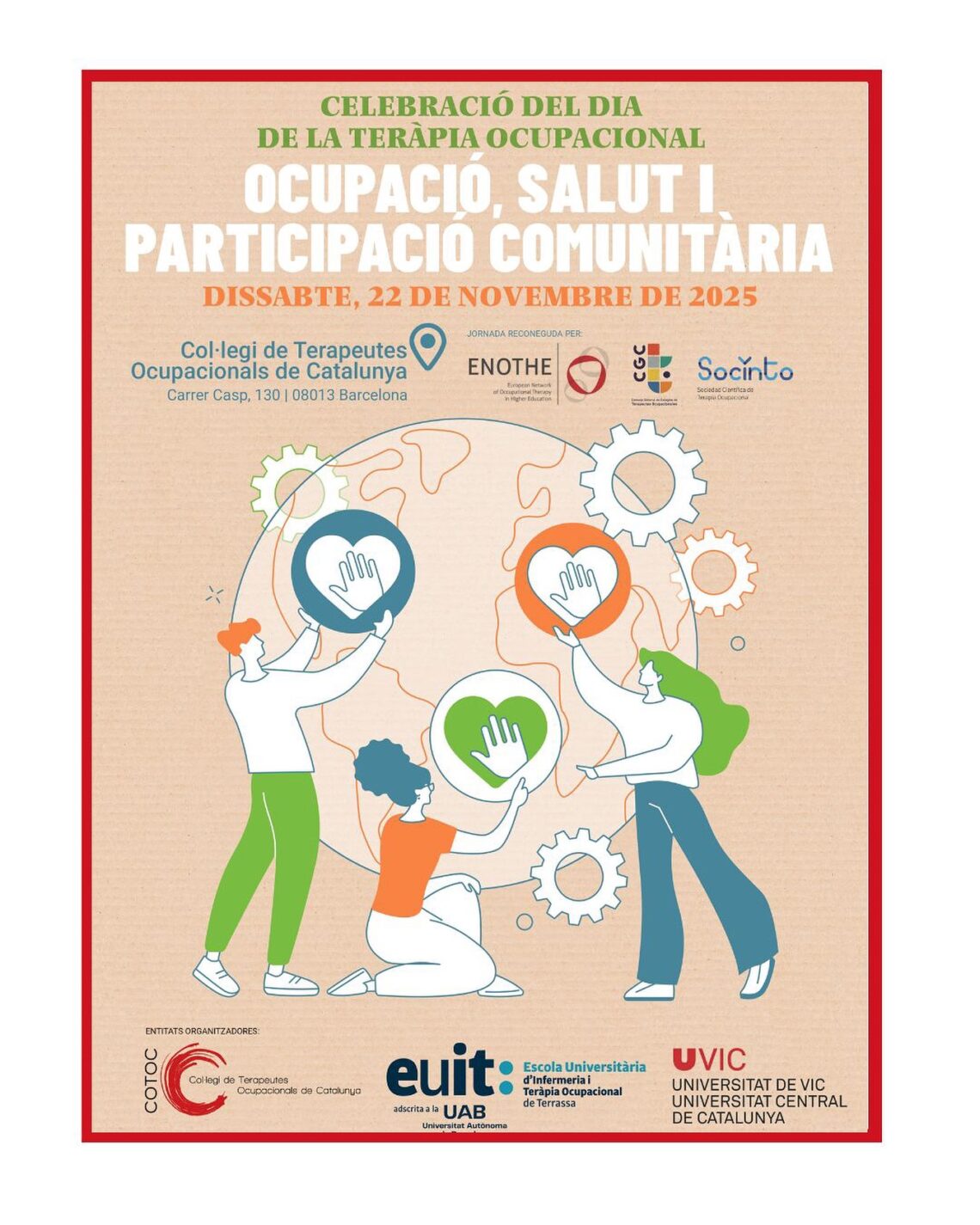 El acto se llevará a cabo en el Colegio de Terapeutas Ocupacionales de Catalunya (COTOC), organizado conjuntamente con la EUIT (Centro Universitario adscrito a la UAB) y la UVic – Universidad Central de Cataluña. Será un espacio para reflexionar, compartir experiencias y continuar poniendo la Terapia Ocupacional en acción al servicio de las personas y las comunidades.